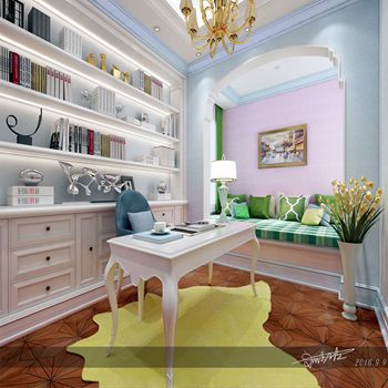 再轉(zhuǎn)角一瞥便是,書香濃濃的書房。書房是智慧和安靜的圣域,白色,海藍色,深色地板的搭配,讓人很快的安靜下來去融入書海中,猶如身臨其境,體驗在書海中暢游的樂趣,累了可以有個軟包沙發(fā)小息片刻。