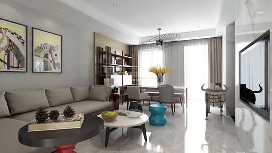 客廳背后是書房,由于男業(yè)主的工作需要,所以封閉的書房是必要的。然而電視墻中間做的玻璃隔斷使得客廳和書房兩個空間可