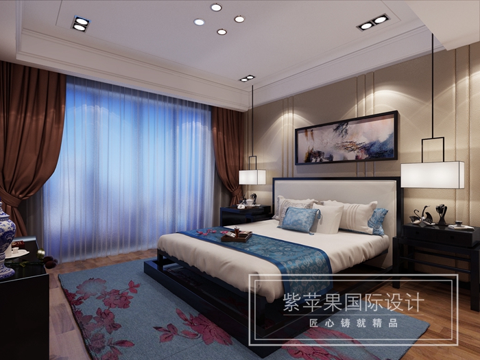 餐廳區(qū)域獨立開辟出一塊羅漢床位置,融合了圍棋對弈、擺件展示、喝茶區(qū)的多功能空間,也使得整個公共區(qū)域更添一抹文化的氛圍和質(zhì)感,臥室里大面積藍色的運用使整個空間更加靜謐安然,有助于忙碌一天的主人更好的入眠,此案活潑大膽的用色體現(xiàn)了設計師對于色彩的把握,讓我們體驗到了不一樣的新中式。