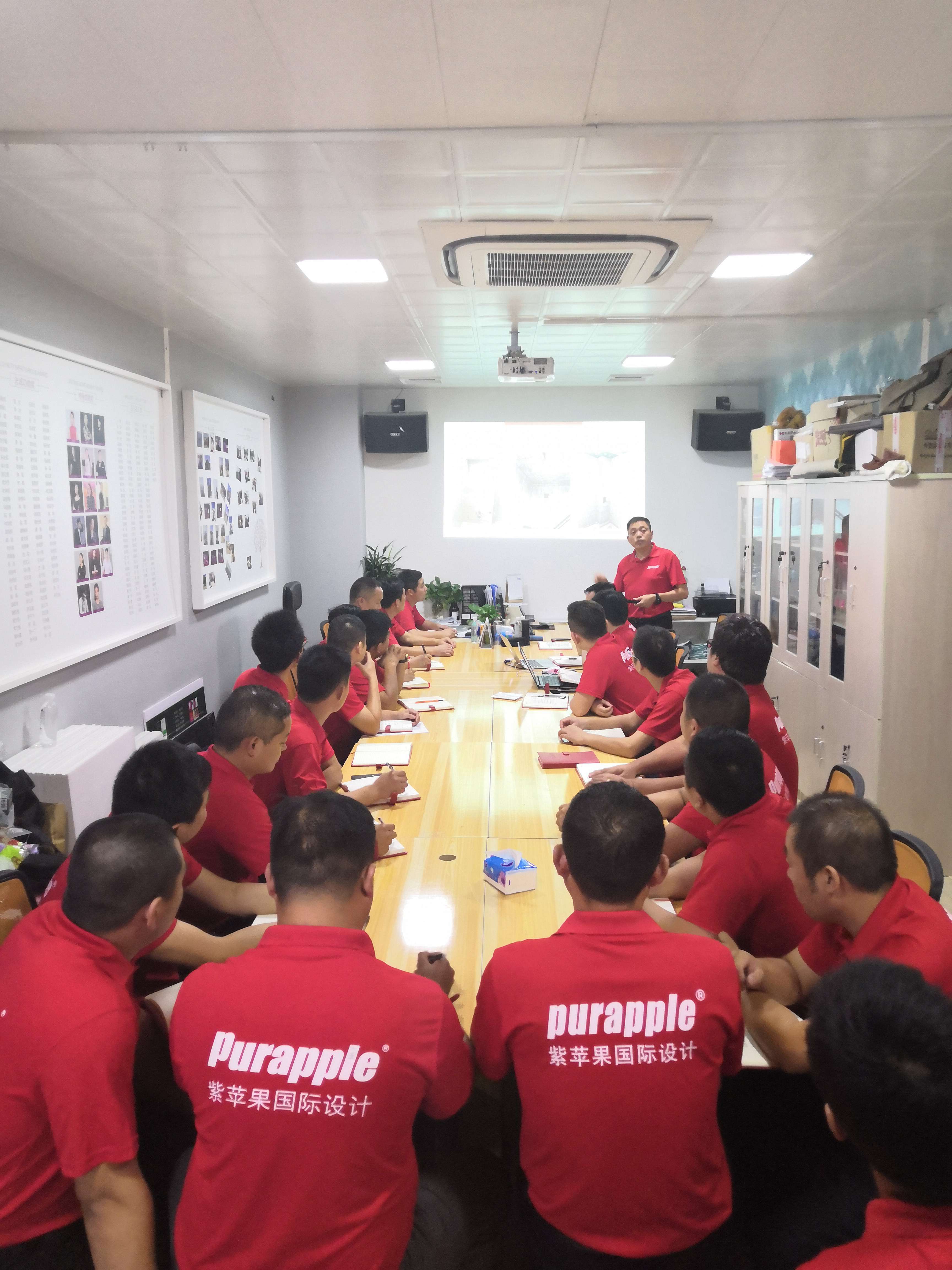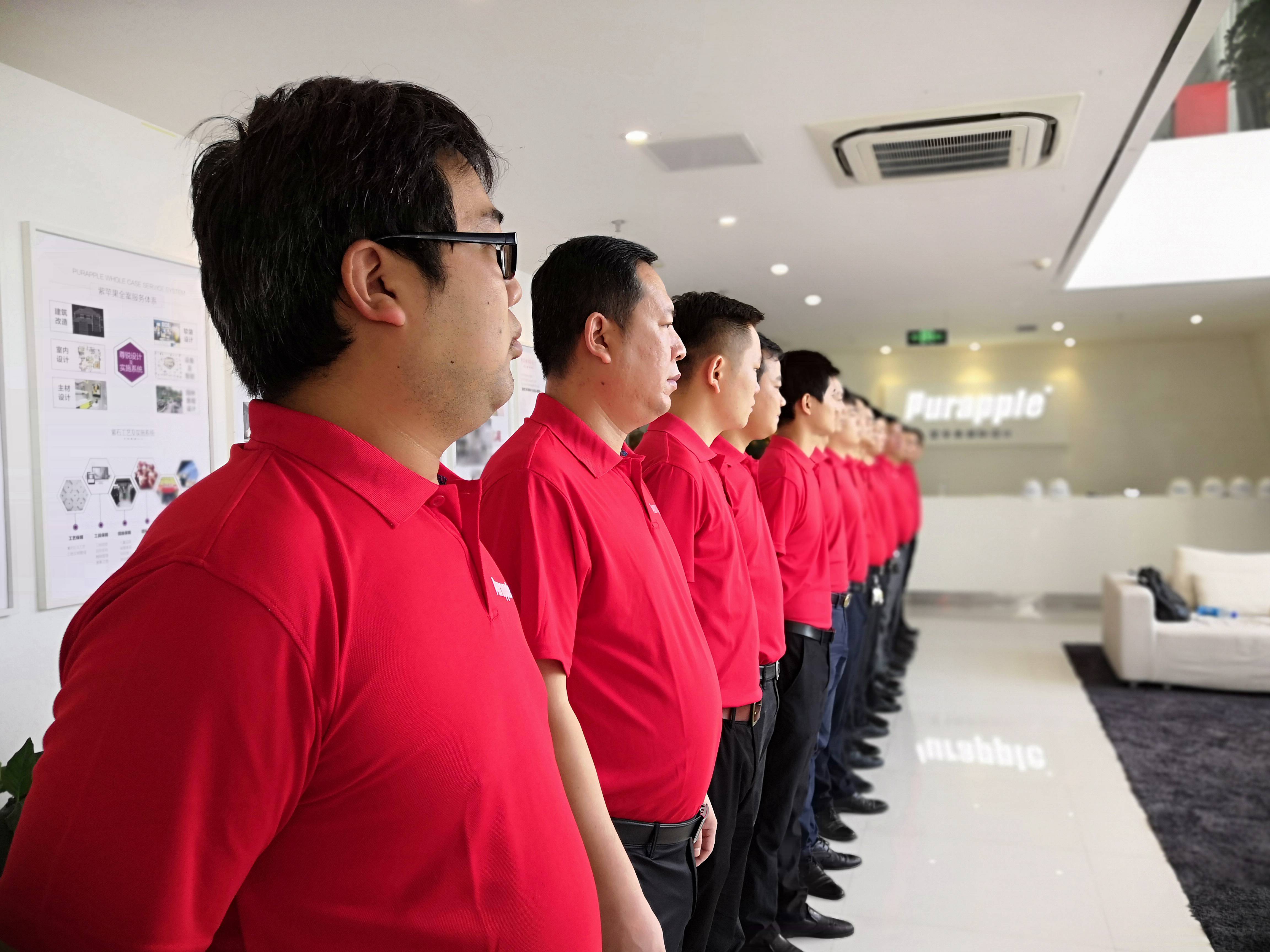 公司整隊(duì),大家喊著齊刷刷的紫蘋果的專屬口號(hào)鼓舞士氣