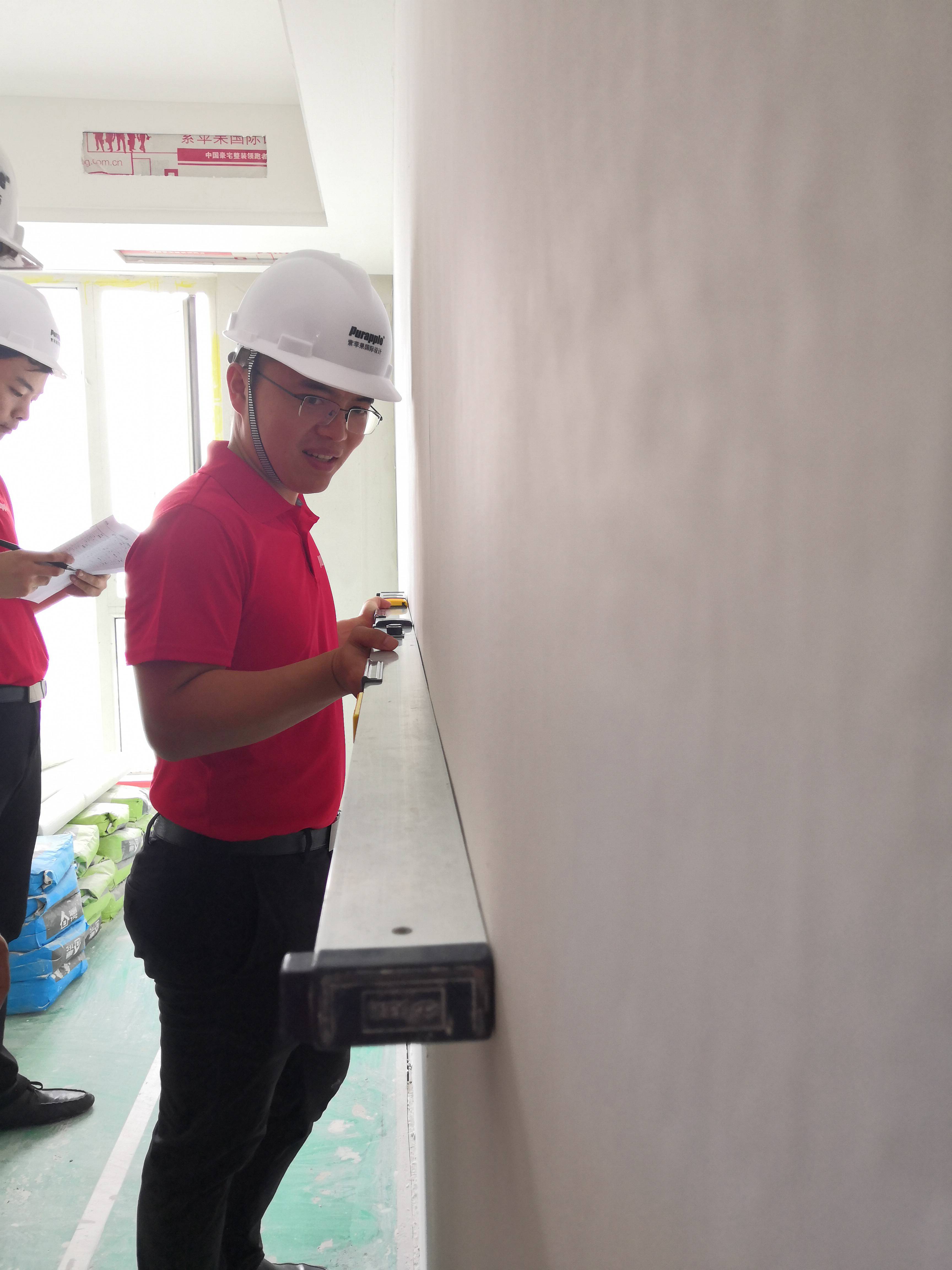 墻面平整度檢查,每個(gè)人都拿出百分百的認(rèn)真勁,用“雞蛋里挑骨頭”形容大家的認(rèn)真絲毫不為過(guò)