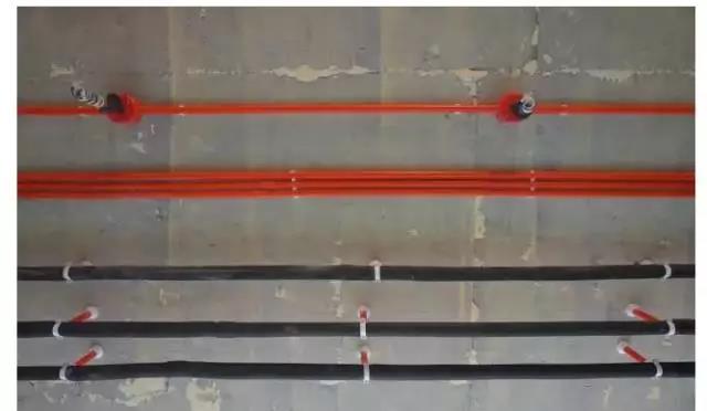 電源線、信號線必須穿入阻燃型線管或黃蠟管內(nèi),地面線管用鍍鋅管卡固定,頂面、墻面線管用中心卡固定。