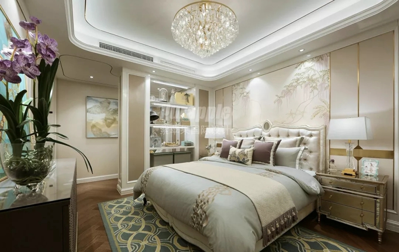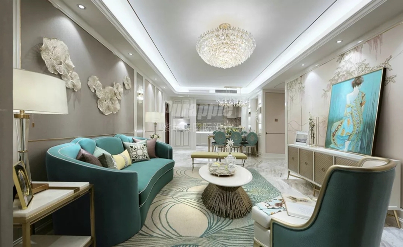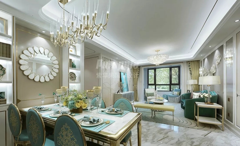 本案戶(hù)型方正,動(dòng)線明朗,因此設(shè)計(jì)時(shí)在結(jié)構(gòu)上未做過(guò)大調(diào)整??臻g整體以白色與米色大面積渲染,同時(shí)穿插少許奢華的金色點(diǎn)綴空間,整體色調(diào)更加豐富而高級(jí)。地板選擇了大理石系,軟裝則以藍(lán)色色系修飾空間,通過(guò)色系的延伸,保持空間跳色風(fēng)格的連貫性。