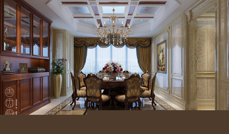 客餐廳空間色彩層次豐富,呈現(xiàn)出歐式風(fēng)格的華貴和浪漫。在布局上采用對稱,配合地面豐富的歐式拼花,每個元素都蘊(yùn)藏著卓然的審美品位,演繹出一曲華貴典雅美妙樂章。