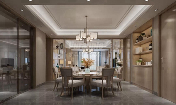 整個客餐廳空間布局中正、大氣、素中有絢。廚房使用自由開關(guān)的推拉玻璃門,最大化的擴(kuò)容空間,與餐廳空間相呼應(yīng),空間不僅有互動感還不失愜意的恬靜。