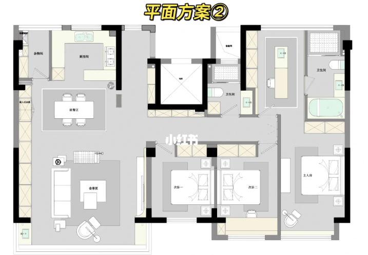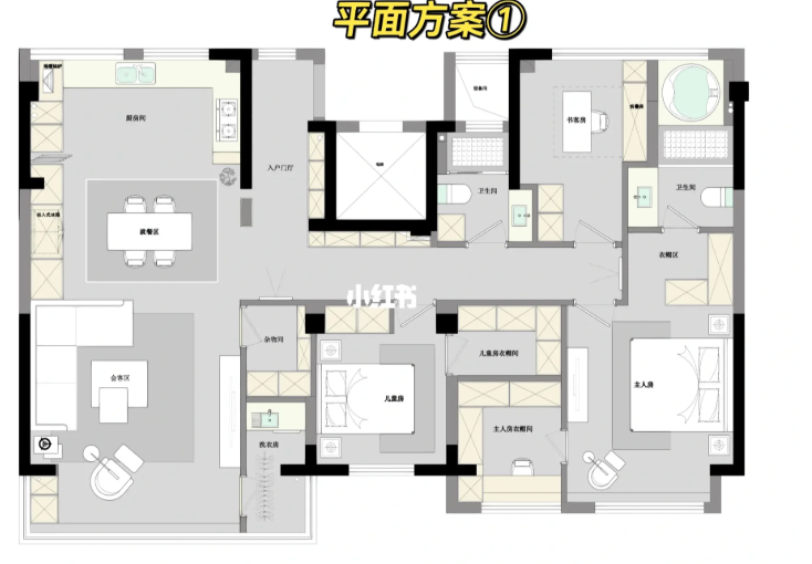 首先做了一個(gè)敞開(kāi)式的大廚房,此方案兩個(gè)臥室,起居室都在南面,一個(gè)大的套房作為主人的休息區(qū),另一個(gè)兒童房,適合小年輕居住,北面的空間主要是小書房和洗浴區(qū)域。