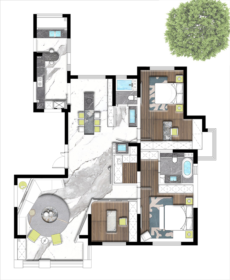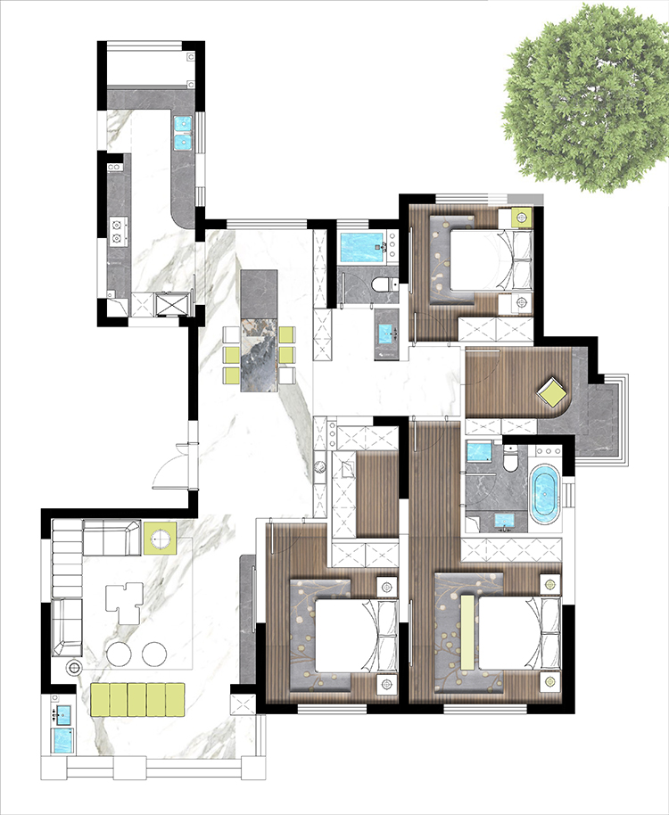 方案一比較常規(guī),進(jìn)門開(kāi)放處理,做了一個(gè)玄關(guān),兩個(gè)房間朝南,餐廳旁邊做了一個(gè)玻璃移門,平時(shí)可以關(guān)起來(lái)!方案二也是設(shè)計(jì)師主推的一套方案,進(jìn)門一個(gè)玄關(guān),整體空間往南面移了一點(diǎn),由于承重結(jié)構(gòu)進(jìn)入客廳的過(guò)道永遠(yuǎn)打不開(kāi),是大平層的空間感提現(xiàn)不出來(lái),所以我們?cè)O(shè)計(jì)師如圖拉了一個(gè)平行的造型,追大程度打開(kāi)這塊空間,然后其他兩塊區(qū)域也劃分明了,大人小孩互不干擾,書房也設(shè)置在南面,整體視野非常開(kāi)闊,可以看到蠡湖風(fēng)景。客戶也很此套方案。方案三也比較常規(guī)