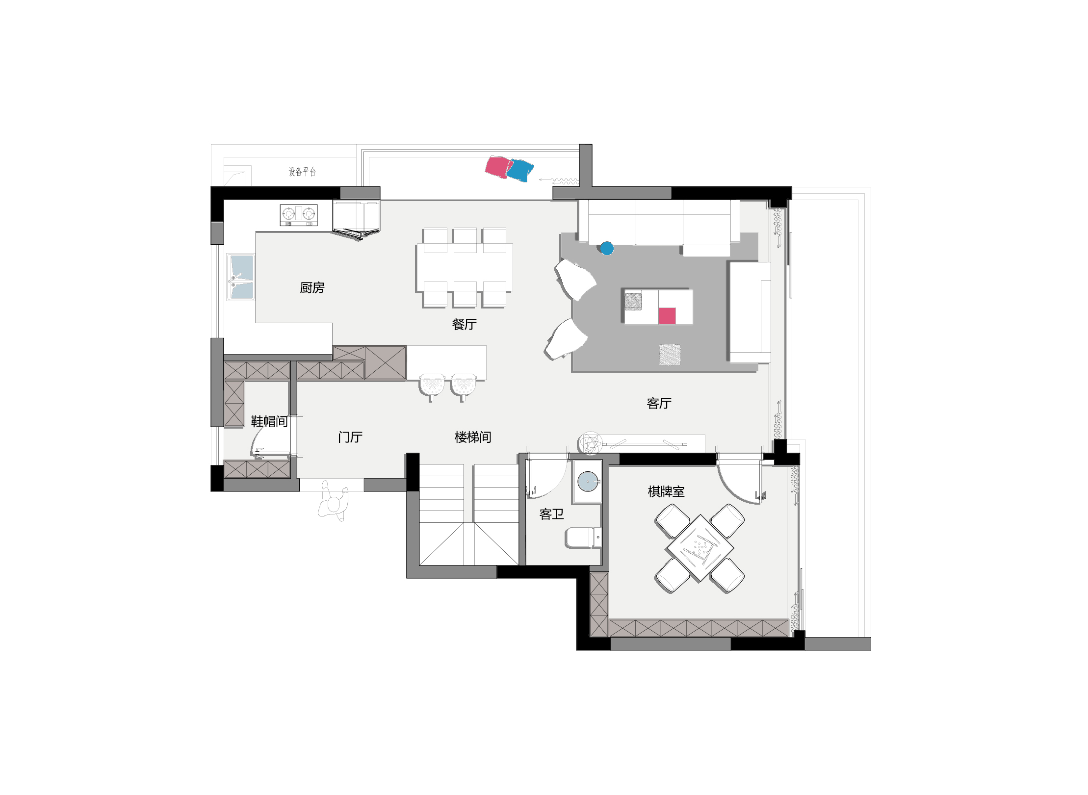 一層方案,一稿是做了一個半開放式廚房,北面做了一個次臥可以方便老人居住,沒做老人房的一稿方案把陽臺打通,是一個開放式廚房,餐廳連在一起的長島臺,南面是一個棋牌室或多功能區(qū),品質很高。層是主要的休息區(qū),方案一做了兩個起居室,一個大套房,另一個方案則做了一個書房,一個大套房,一個次臥。