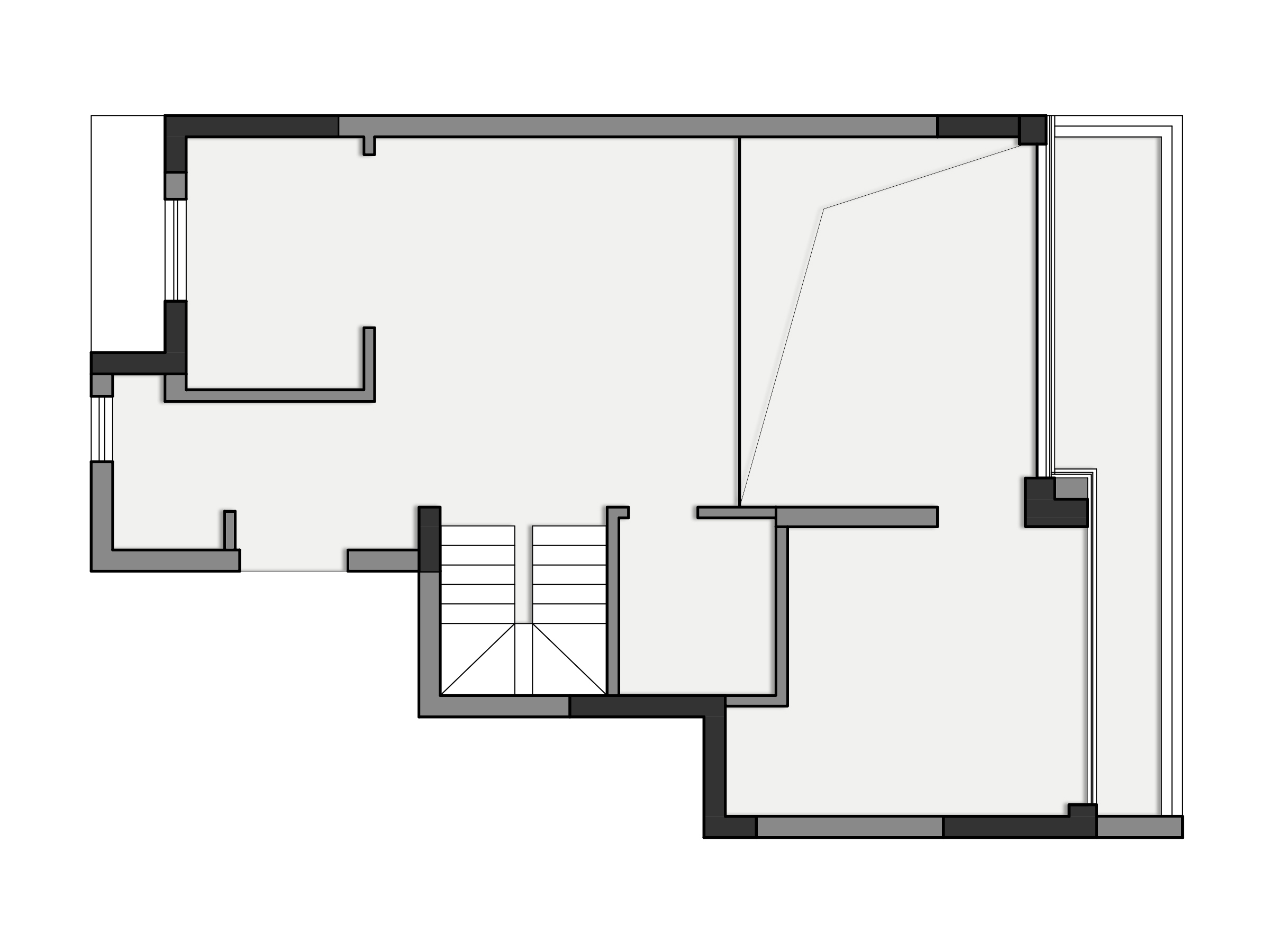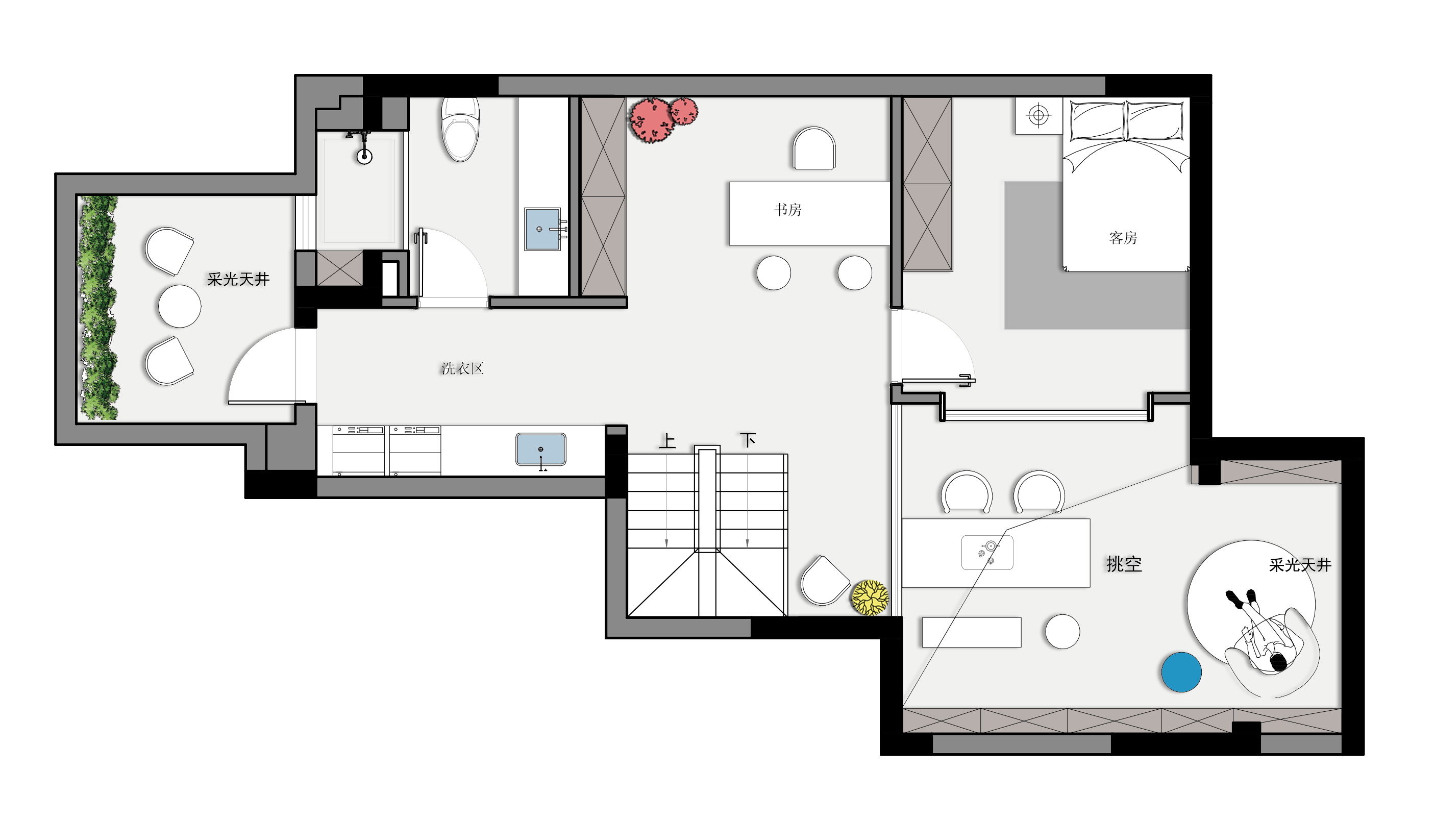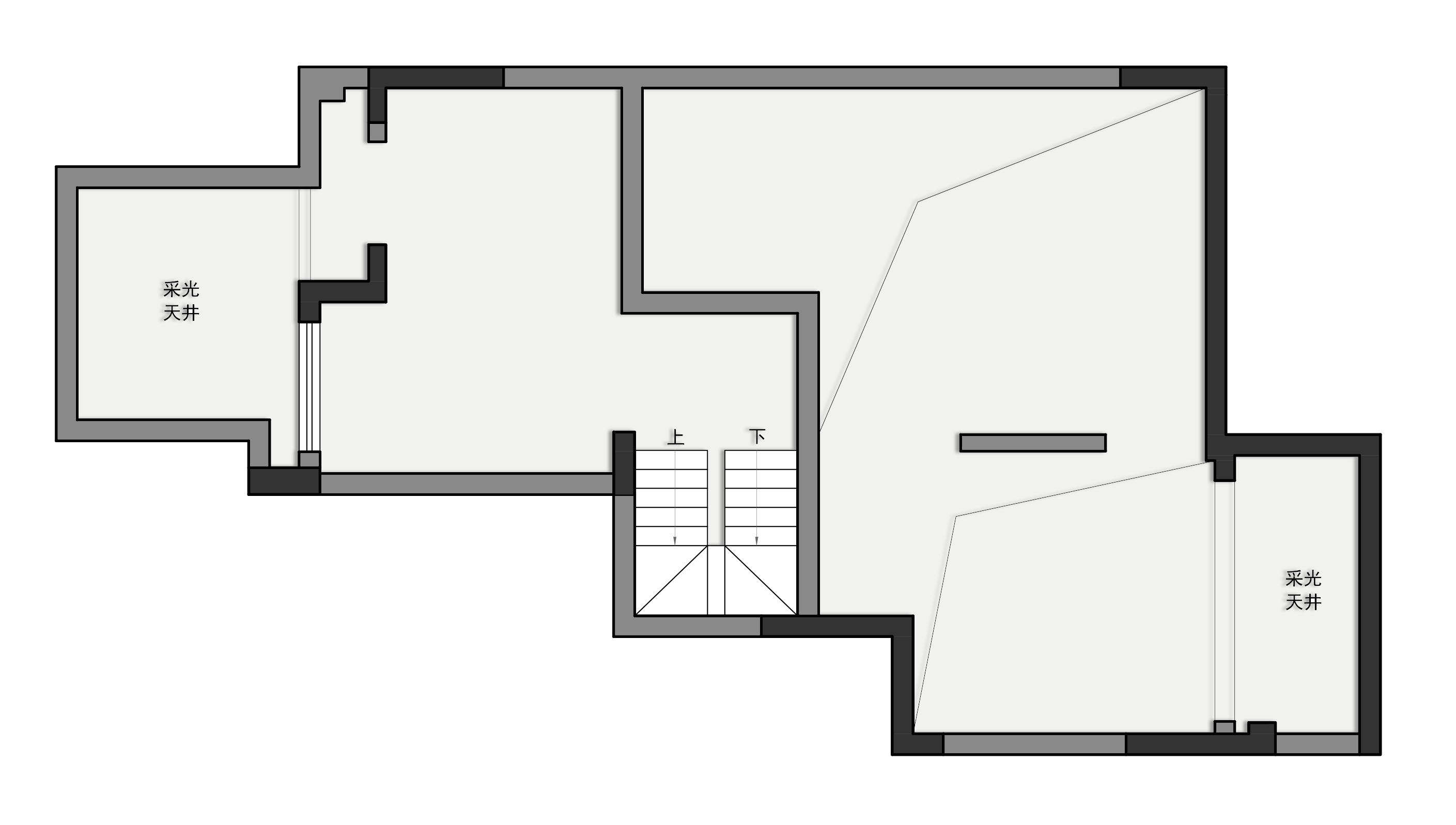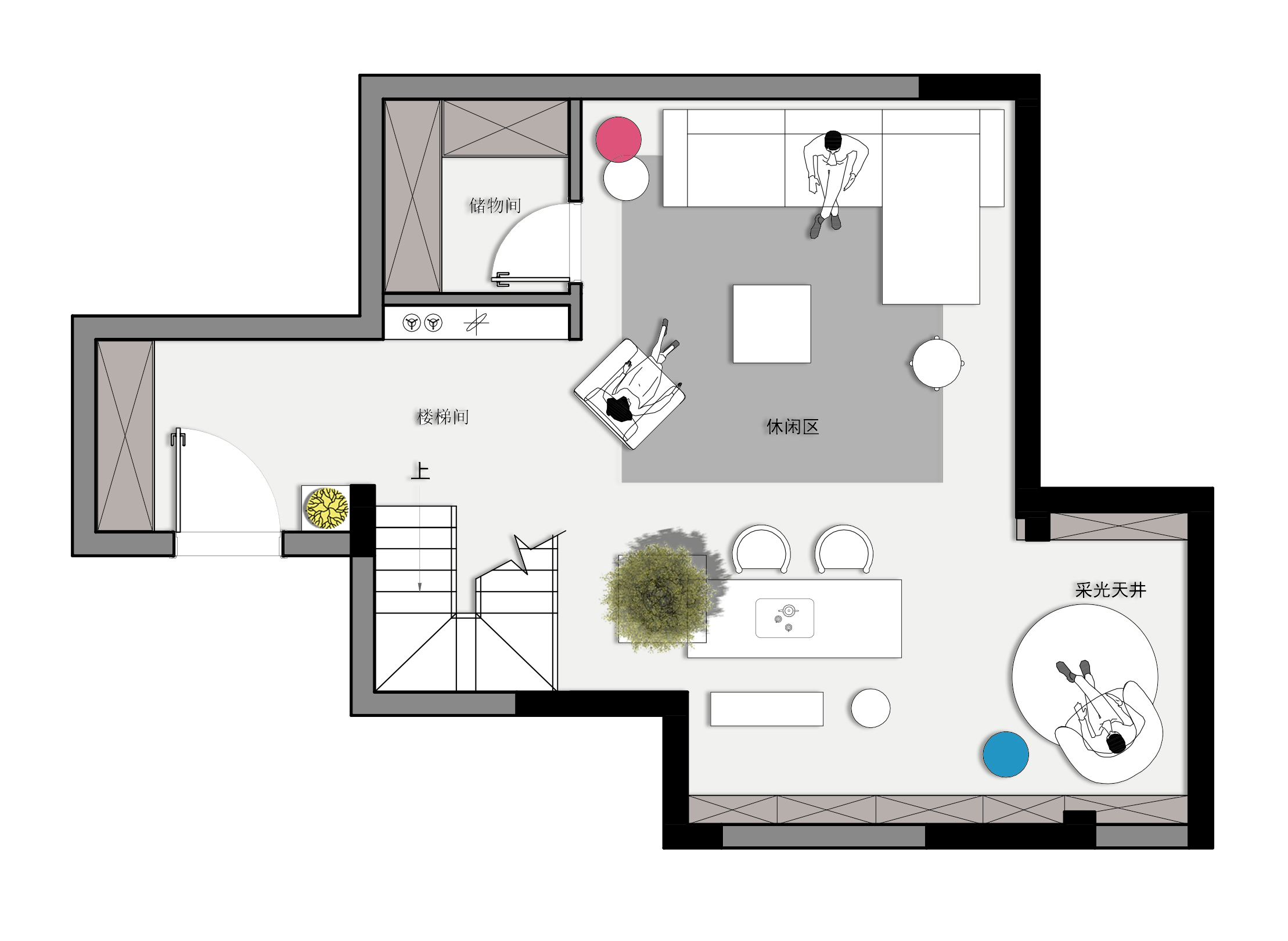 3?負(fù)一層保留了大挑空,結(jié)合少量現(xiàn)澆,把空間變得更方正,利用率更高。將北面采光井也納入室內(nèi)規(guī)劃范圍,難處理的Z字形承重柱用柜子做裝飾,滿足了儲(chǔ)物需求,空間也更加美觀。這個(gè)空間主要作為多功能的書房和儲(chǔ)物間來使用,滿足客戶工作、閱讀、儲(chǔ)物等需求。