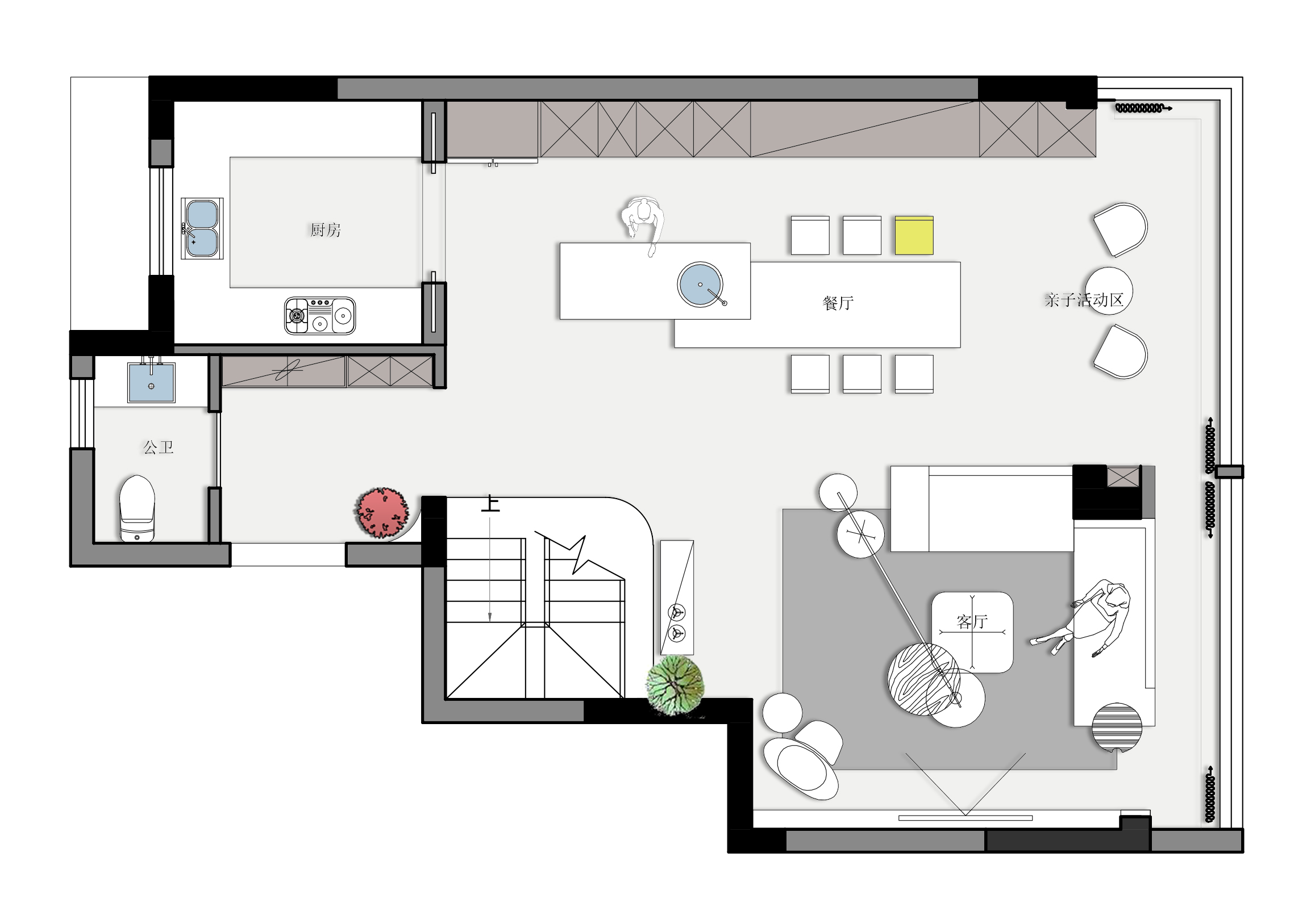 1?一層通過敲砌墻調(diào)整了空間的完整性。入戶做了一個(gè)比較大的入戶衣帽間,中廚設(shè)計(jì)了開放式和閉式兩種方案,搭配西廚島臺(tái)使用,增加了餐廚空間。在這稿方案中,對(duì)一樓公衛(wèi)進(jìn)行了保留,朝南設(shè)置一