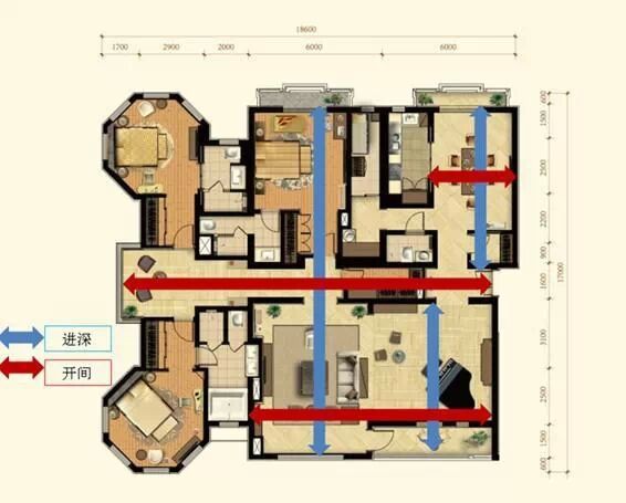 開(kāi)間、進(jìn)深:習(xí)慣上,我們把房間的主采光面稱(chēng)為開(kāi)間(面寬),與其垂直的稱(chēng)為進(jìn)深。也可根據(jù)房間門(mén)的朝向來(lái)確定開(kāi)間和進(jìn)深,房門(mén)進(jìn)入的方向的距離為進(jìn)深,左右兩邊距離為開(kāi)間。