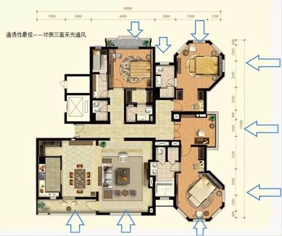 通透性主要是指戶(hù)型的通風(fēng)和采光性能。要保證戶(hù)型具有良好的通透性能,首先要求戶(hù)型要有良好的進(jìn)深開(kāi)間比,即戶(hù)型比較方正;其次戶(hù)型最好有兩面可以采光和通風(fēng),相對(duì)兩面采光通風(fēng)最佳(如南北、東西)。