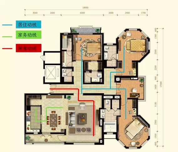 好的動(dòng)線(xiàn)能夠提升戶(hù)型利用率,而差的動(dòng)線(xiàn)會(huì)使大戶(hù)型變得“大而無(wú)當(dāng)”,浪費(fèi)空間。戶(hù)內(nèi)主要?jiǎng)泳€(xiàn)有三類(lèi),分別是居住動(dòng)線(xiàn)、家務(wù)動(dòng)線(xiàn)、來(lái)客動(dòng)線(xiàn)。