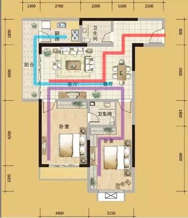 動(dòng)線(xiàn)良好(從入戶(hù)門(mén)進(jìn)客廳、臥室、廚房的三條條線(xiàn)不會(huì)交叉)范例如下: