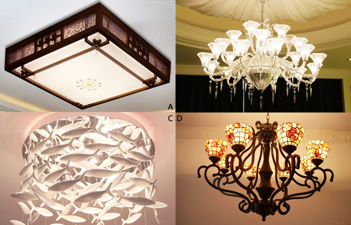B、有水晶、珠子及許多精巧細(xì)節(jié)設(shè)計(jì)的吊燈
