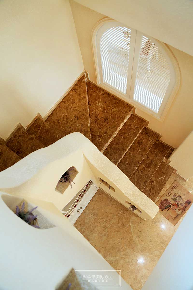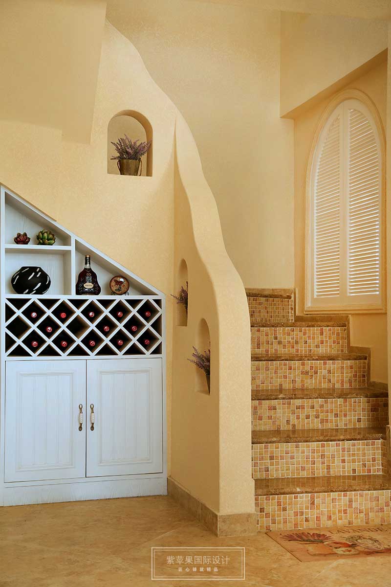 樓梯這邊扶手,給人的感覺更為自然,散發(fā)著地中海的那種休閑氣息。巧用空間設(shè)置了一個簡易的酒柜。