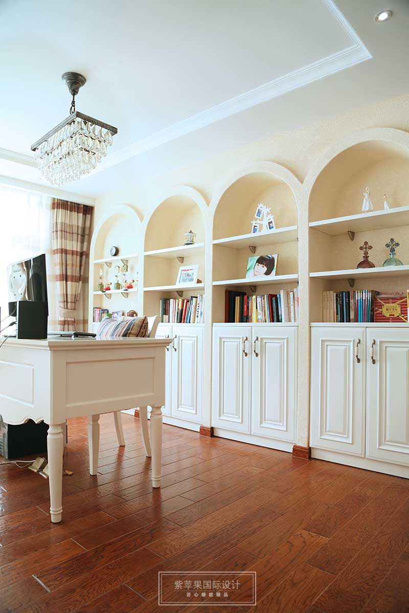 白色的書房依舊延續(xù)整體風格的簡單與安寧。弧形書柜柔化空間的線條,大面積儲物空間,既有充足的空間擺放書籍,也可以方便業(yè)主為來客展示自己家人的回憶和自己心愛的藏品!