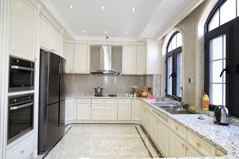 白色的櫥柜加白色的大理石地面和花式臺面,廚房給人的感覺清潔,明亮,視覺上很舒服。