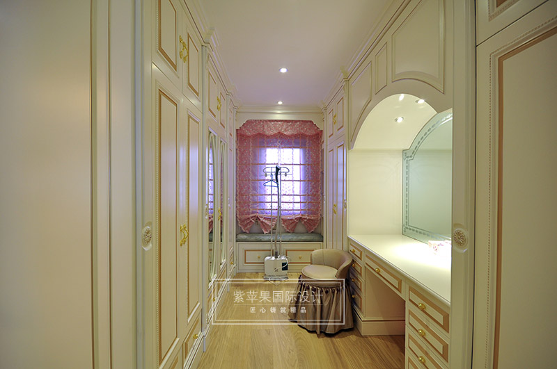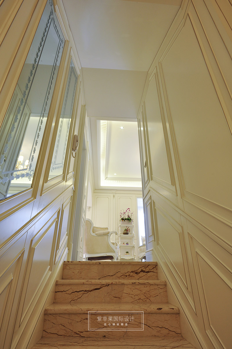 過道處的細節(jié)處理上,制作工藝清細考究,在壁燈柔美燈光的映襯下,造舊白的色澤十分干凈,簡單不失高雅氣息。簡潔自然的線條勾勒出過道空間的浪漫典雅。