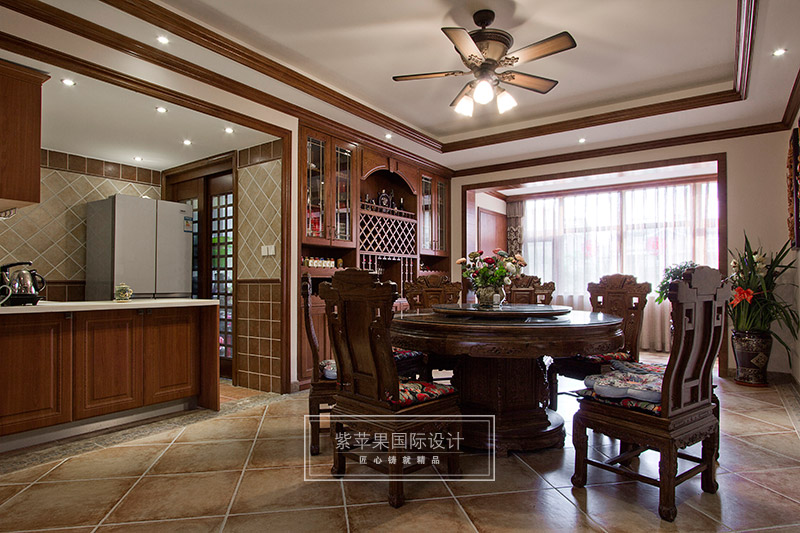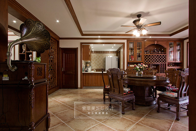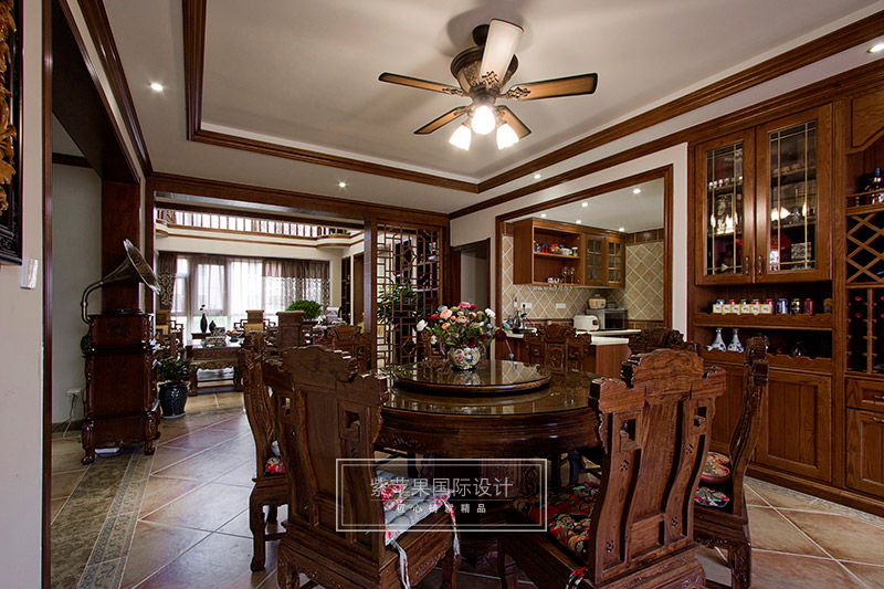 就餐時(shí),角落里的古典留聲機(jī),將那悠揚(yáng)的曲子從遙遠(yuǎn)的時(shí)代傳遞到現(xiàn)代,讓人變得仿佛穿越般的恍惚。中式家具作為古典元素在空間里的運(yùn)用,將中式情懷納入空間之內(nèi),而空間里并非只是簡單的古典元素攫取,設(shè)計(jì)師將主人的個(gè)性與反應(yīng),以及居住舒適性的現(xiàn)代需求融入在居室里,讓空間形成獨(dú)一無二的符號。