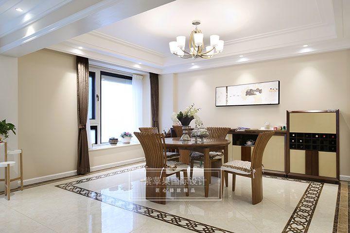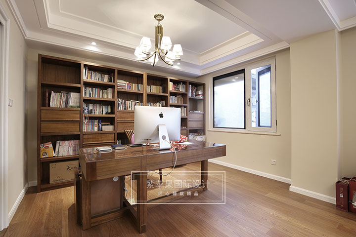 溫暖棕色的書桌,書柜,奠定空間簡約,自然的基調(diào),客廳,餐廳,書房均采用了款式一致的吊燈,優(yōu)美的造型,柔和舒適的光線,讓空間更具優(yōu)雅,美感。