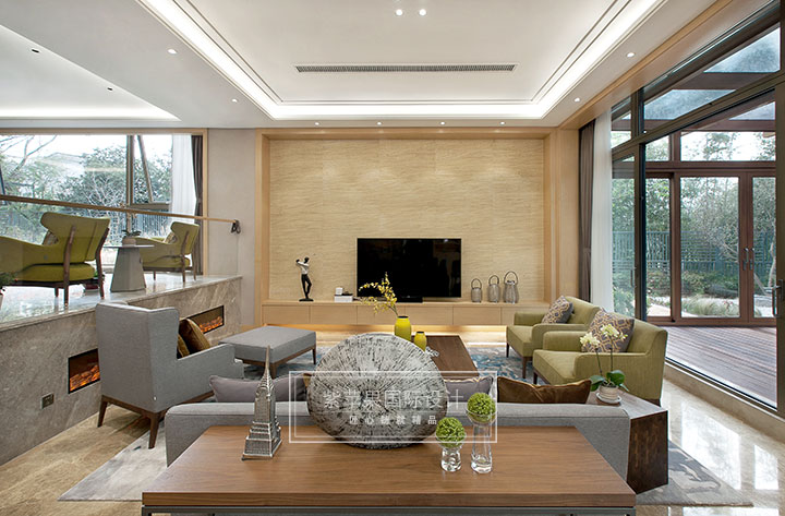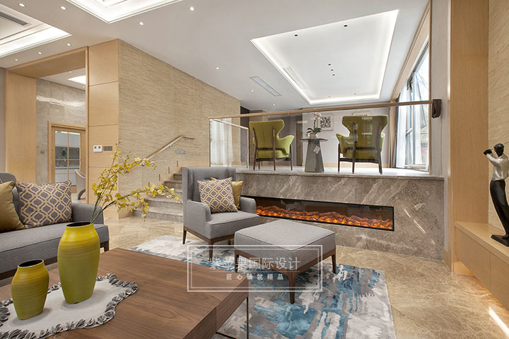 客廳設置內(nèi)嵌式電子壁爐,巧妙創(chuàng)新有樂趣;錯層處運用玻璃扶手,增強整個空間通透之感,讓視線廣闊無遮攔。電子壁爐和玻璃扶手的運用,都可以看出設計師從細節(jié)出發(fā)極力在營造一個精致、大氣、現(xiàn)代感十足的生活空間。