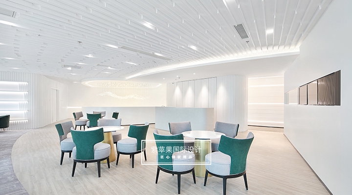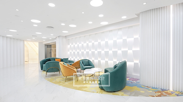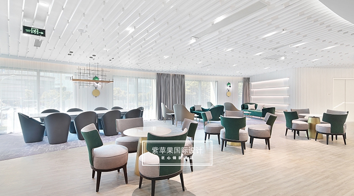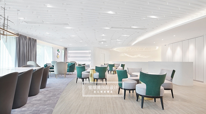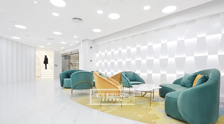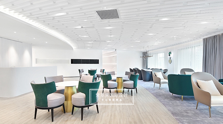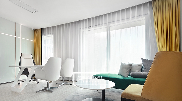 大堂設(shè)計貼合現(xiàn)代極簡理念,充分利用空間安置多功能區(qū),大面積留白的區(qū)域搭配由明黃、湖綠和金屬色組成的軟裝,軟硬裝格調(diào)統(tǒng)一凸顯質(zhì)感。二樓地面多采用地板、地毯等材質(zhì),有效降低女士腳踩高跟鞋發(fā)出的噪聲干擾,也會提高她們在走路時感受到的舒適感。洽談區(qū)的落地玻璃窗廣納自然光線,將朝暮風光、四時景致全盤納入其中,為空間點染別樣雅致的氣息。