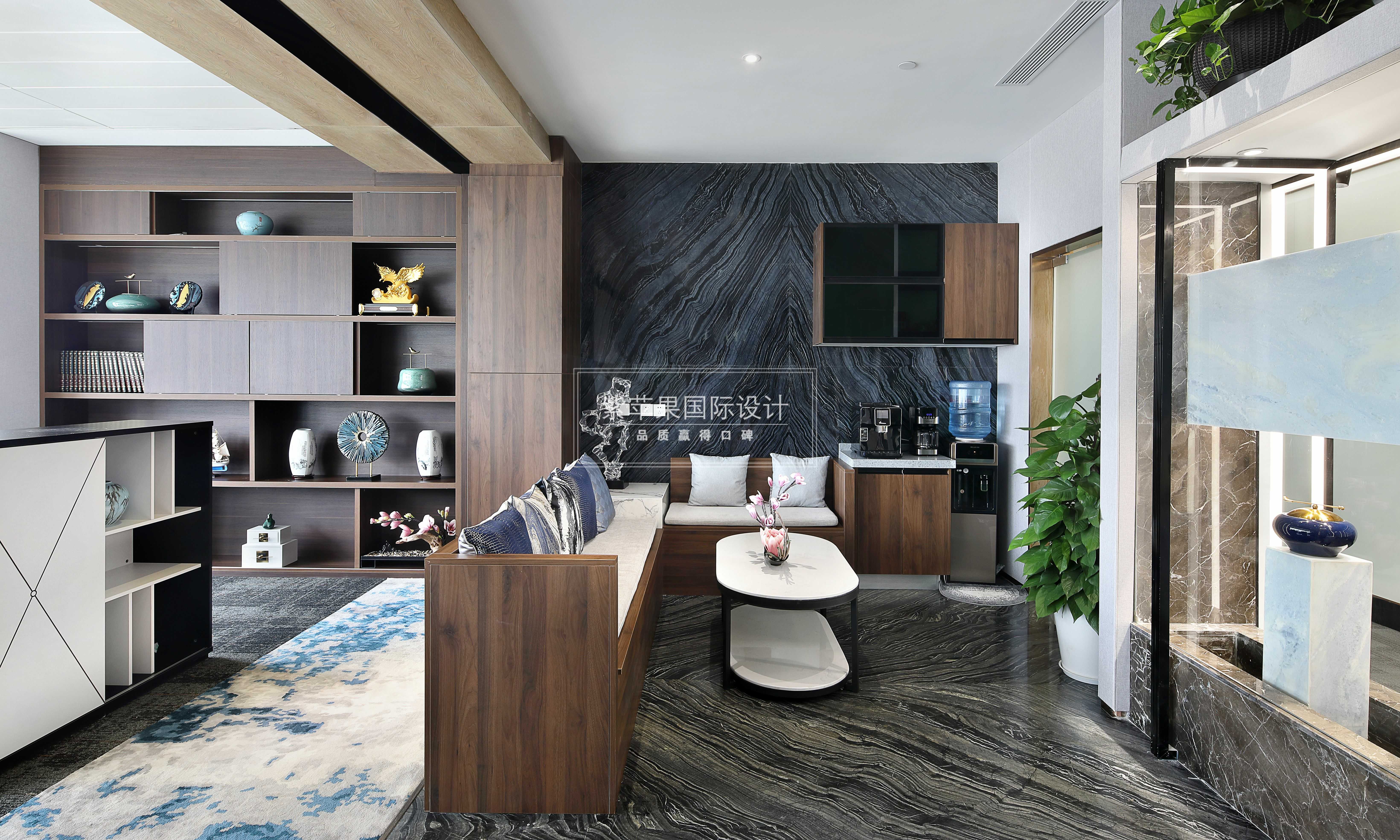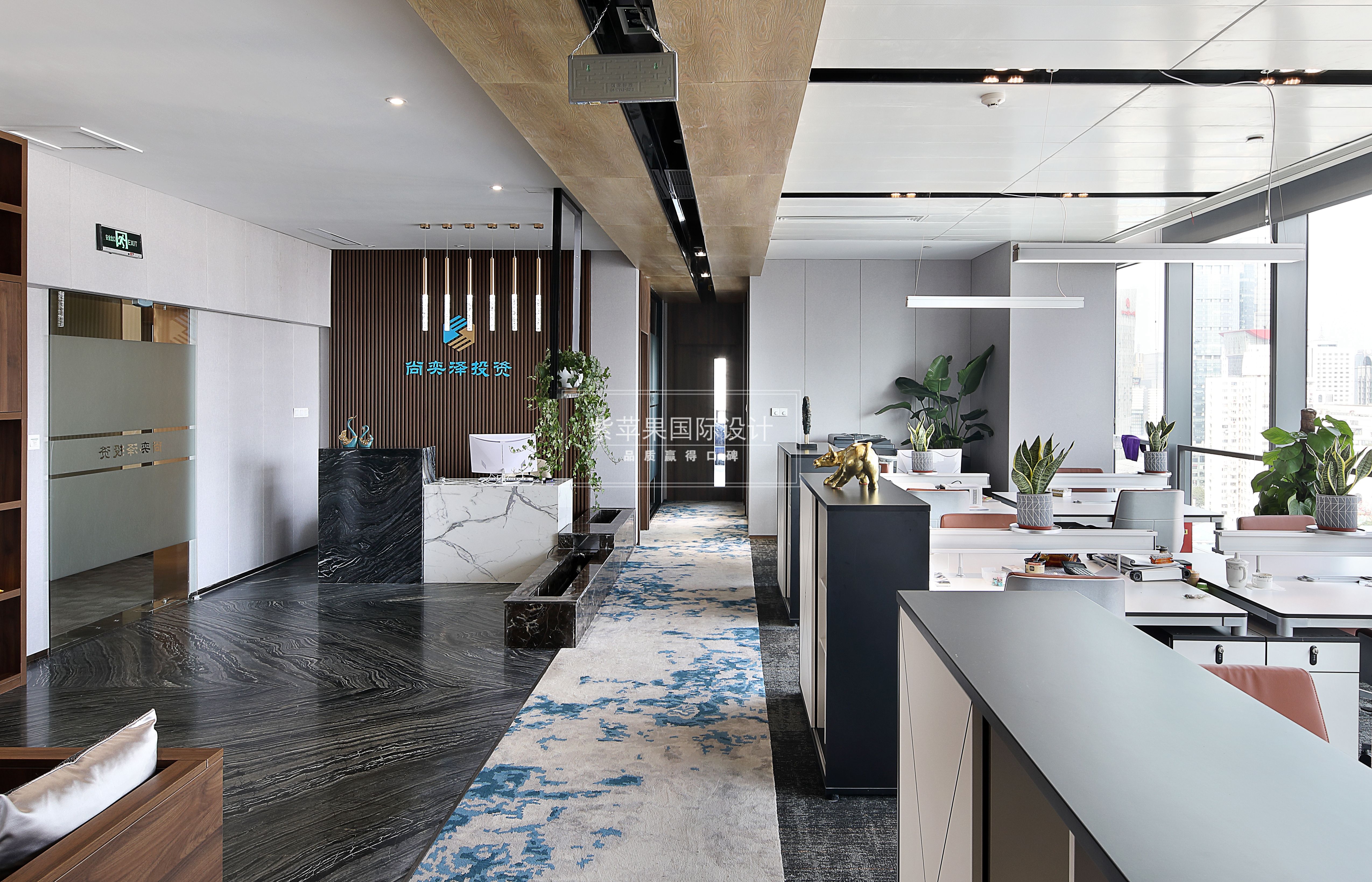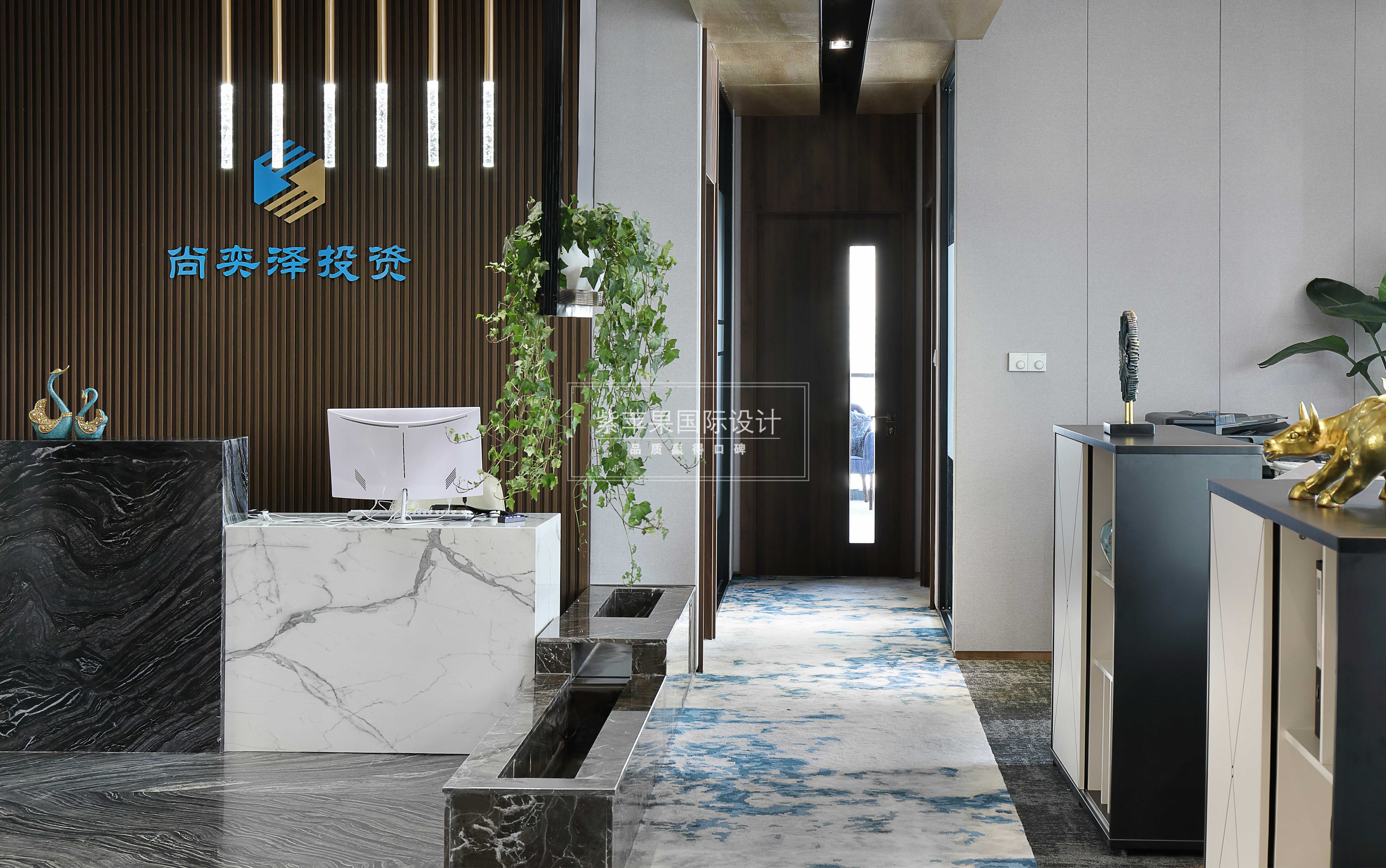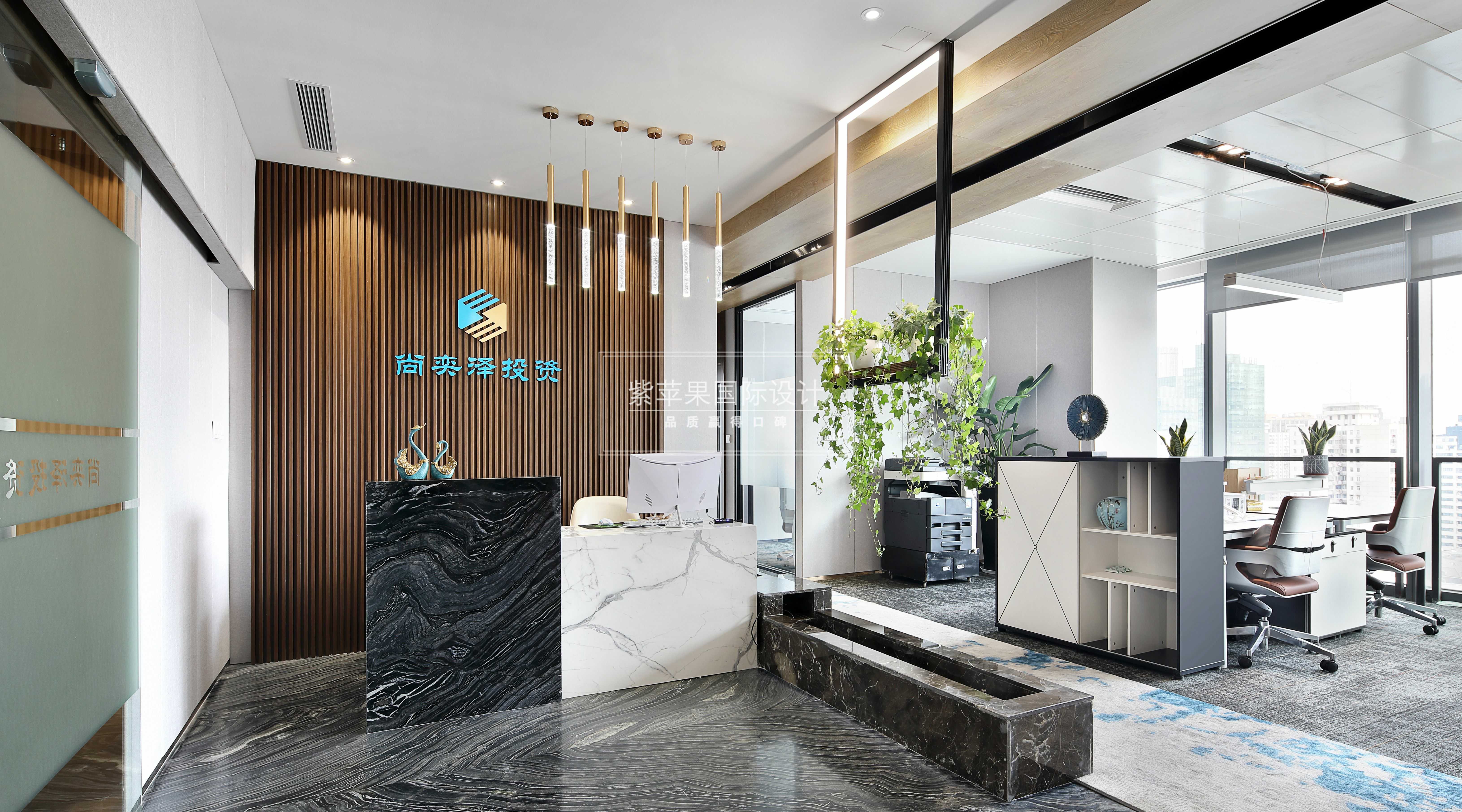設(shè)計理念:業(yè)主是金融人士,個人對裝修品質(zhì)有一定要求,注重風水及命理,喜木喜水,對員工也很體貼。所以整體設(shè)計在滿足辦公正常需要的同時,通過各種材質(zhì)和細節(jié)巧妙融入風水觀念,一個現(xiàn)代風格的辦公環(huán)境呈現(xiàn)而來。