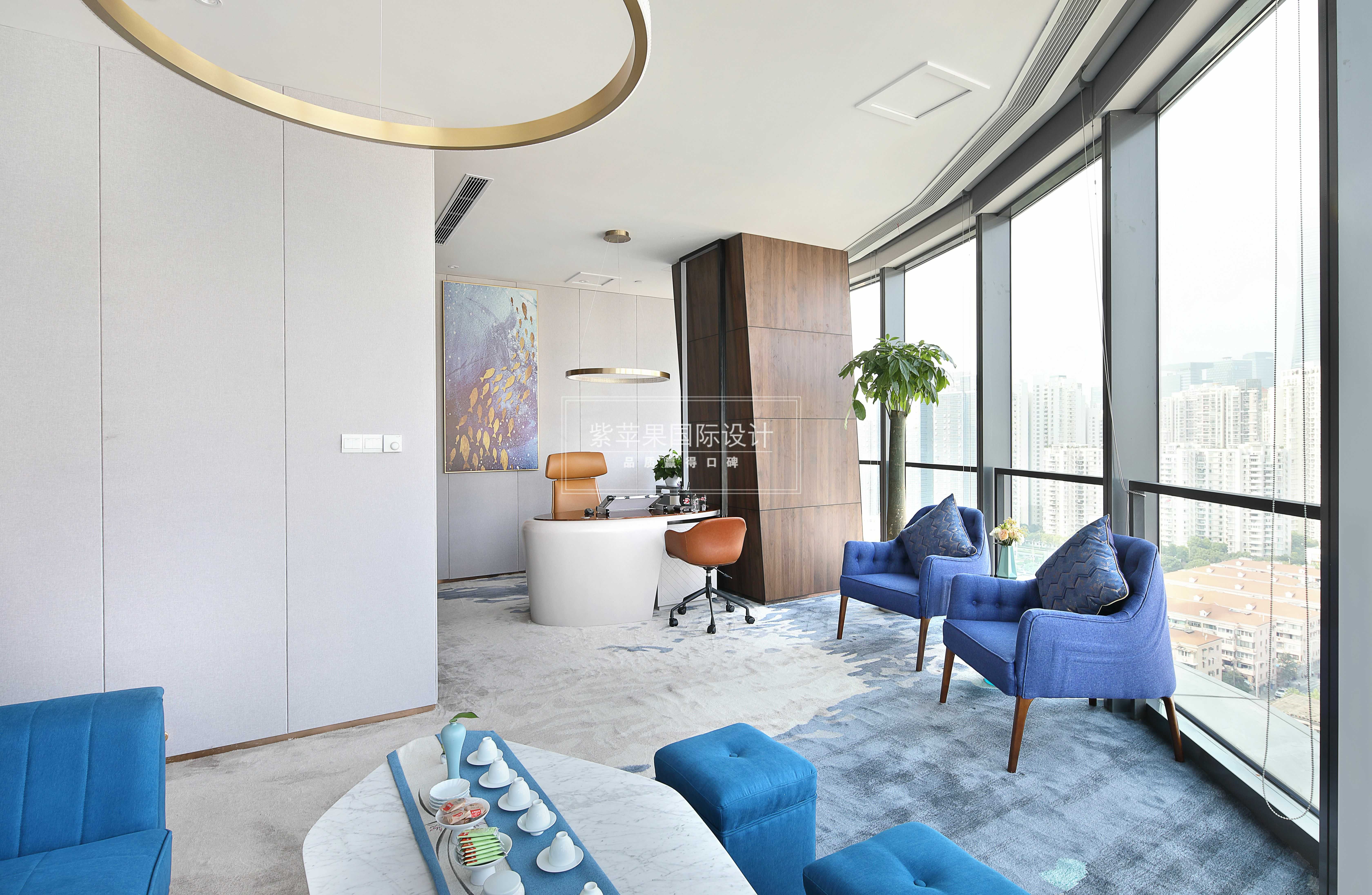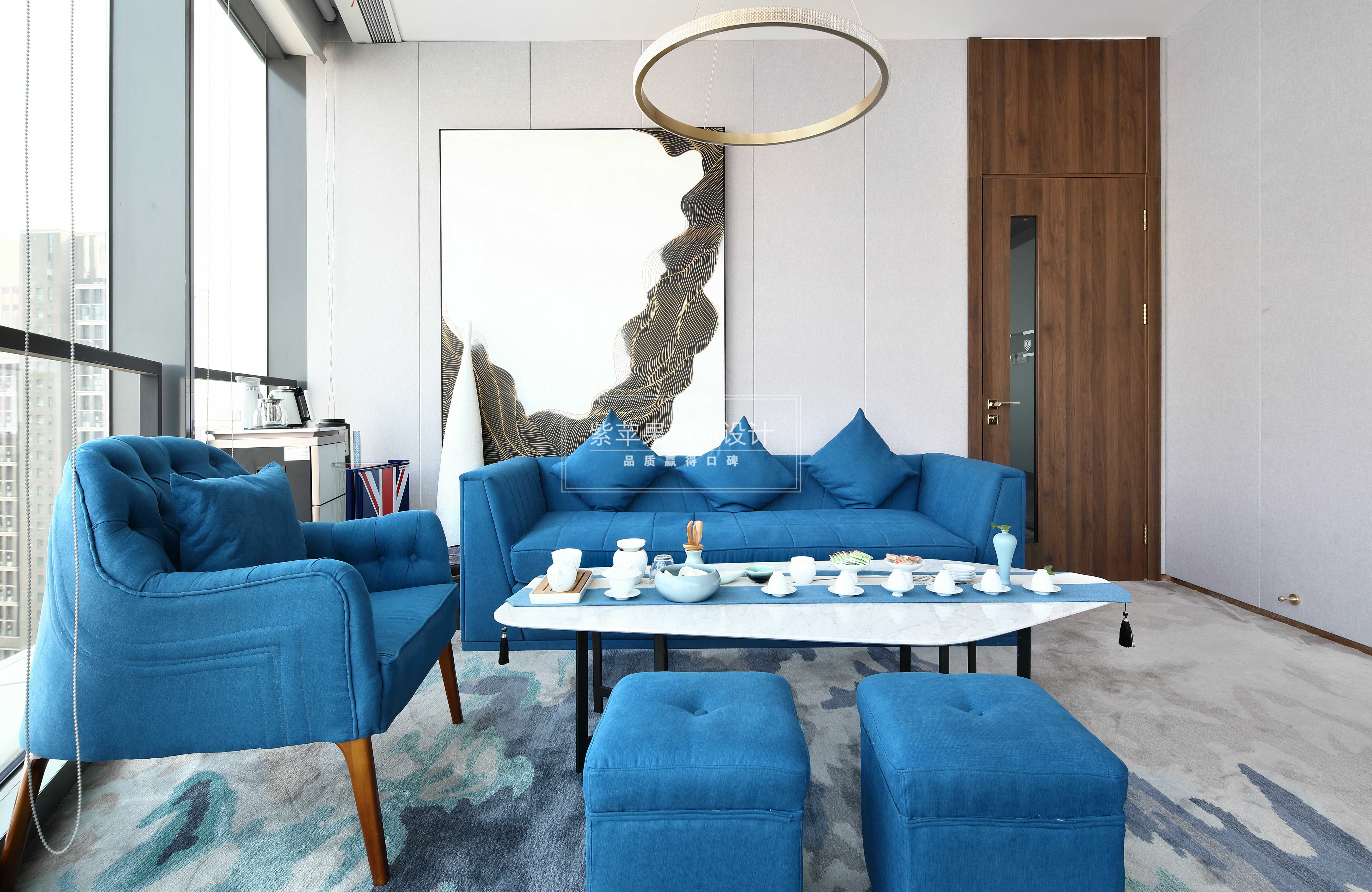 洽談區(qū)選用湖藍色作為軟裝布藝沙發(fā)的主基色,與水波紋的地毯搭配的恰到好處。矮桌上的淺藍色茶具精致小巧,室內(nèi)不同明度的藍色在色調(diào)上保持一致,給人視覺上柔和素凈的感官體驗。