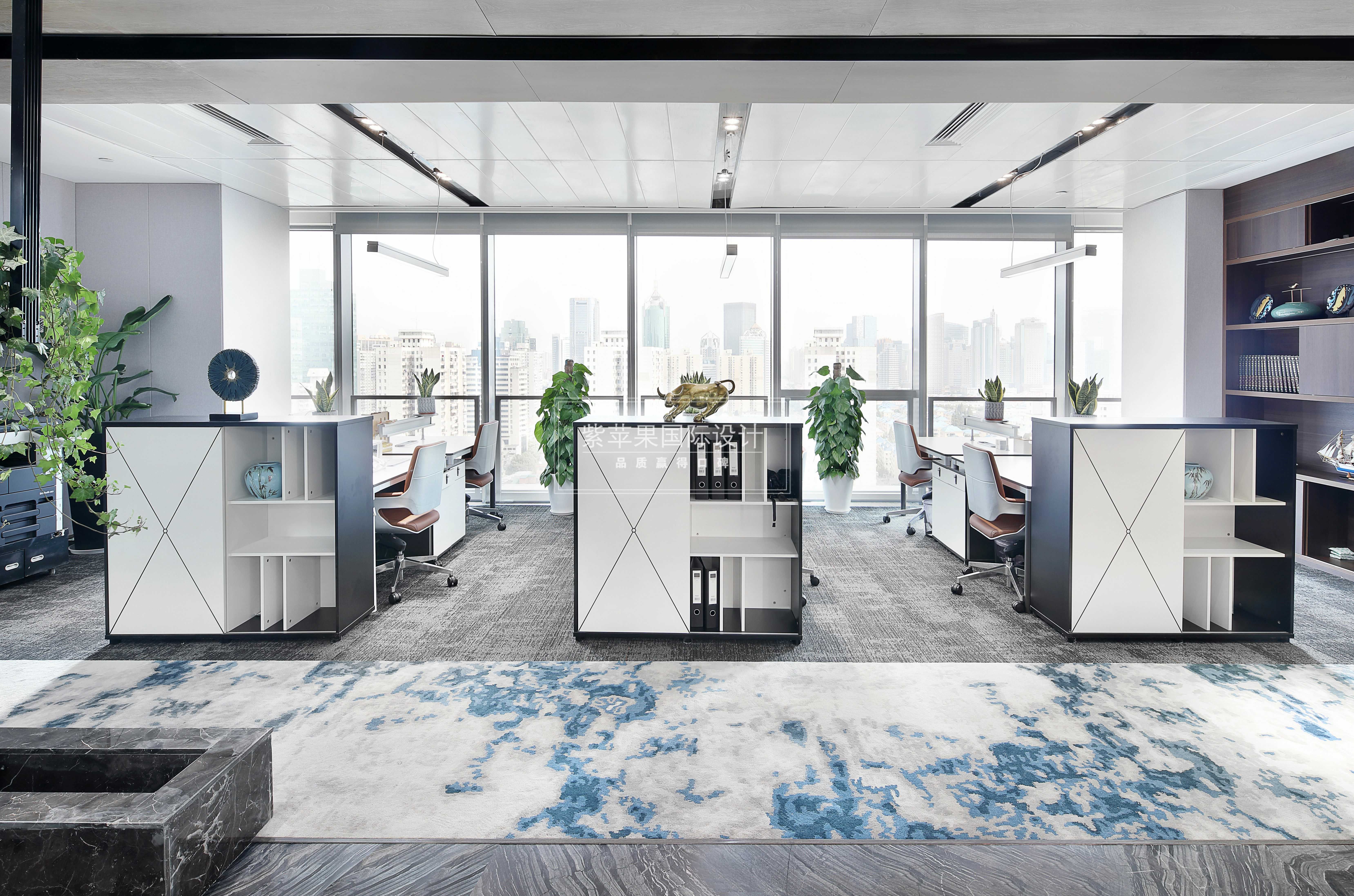 藍色潑墨圖案的地毯為通向其他場所巧妙的設(shè)置出了一條引導路線,也將辦公區(qū)域和前臺接待區(qū)很好地隔離開來,劃分功能區(qū)的同時也保證了美觀性。