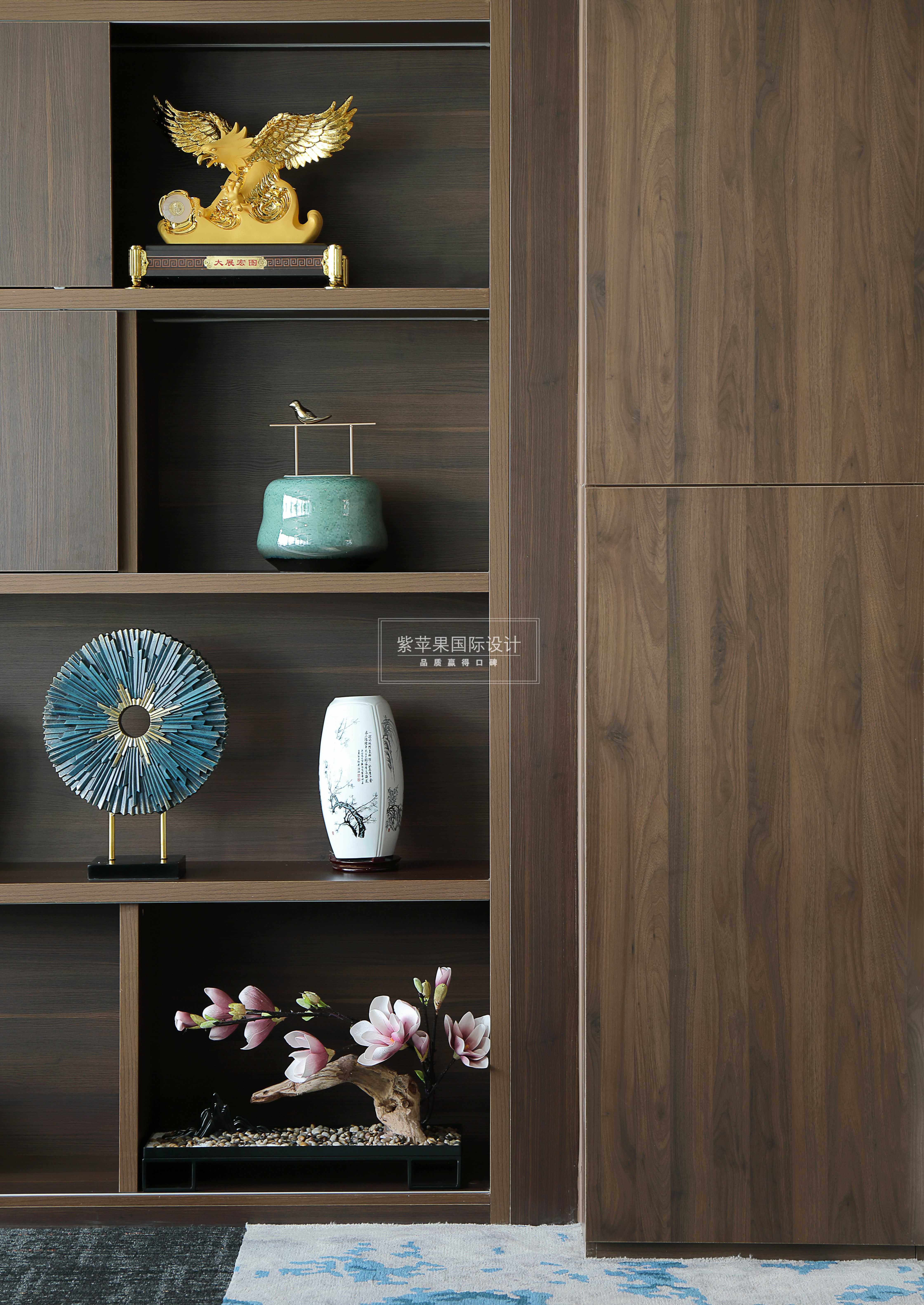 靠墻位置用一面半開放式的展示柜作墻面造型,收藏了很多形狀、顏色及材質(zhì)各異的藝術(shù)品,每個藝術(shù)品都有其內(nèi)在的深層含義,既彰顯了公司主人的獨特品位,又增添了空間的質(zhì)感和藝術(shù)觀賞性。