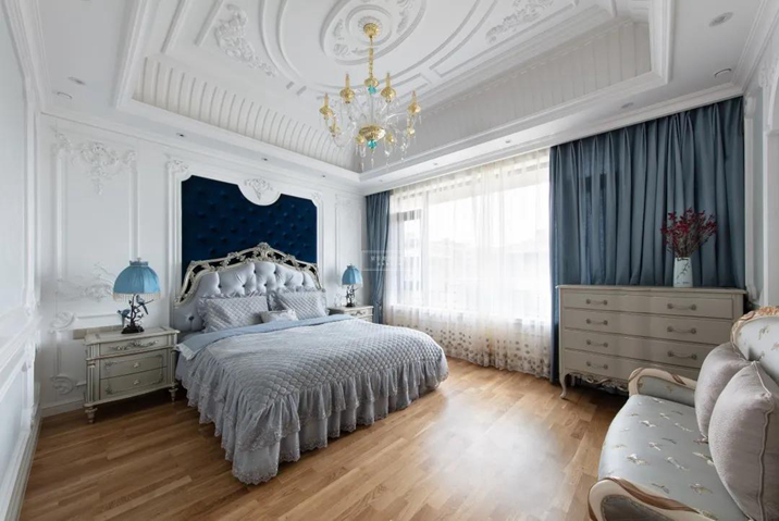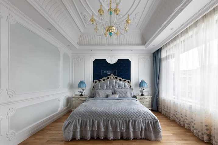 天花板、墻壁石膏雕花線條配合著絨布軟包的背景墻,獨占這一室的雅致輕盈。