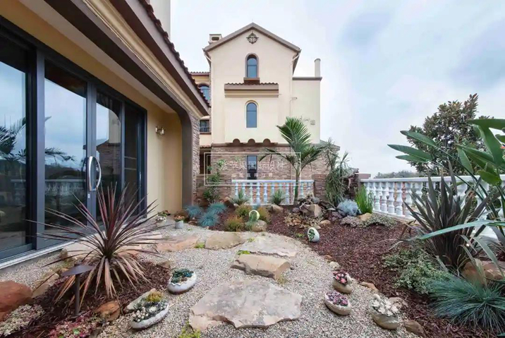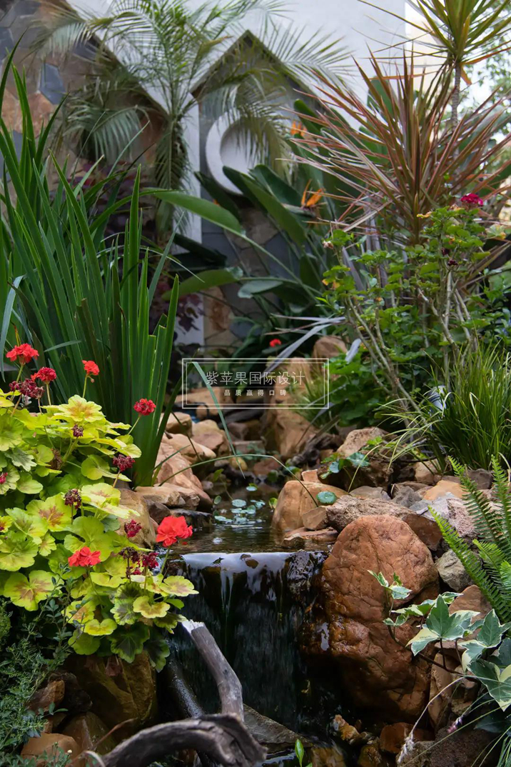 南向的花園采用旱式景觀,綠植選擇上也選配了小檳榔、甘青針茅、大鶴望蘭、膨珊瑚、七彩鐵、佛珠等抗旱的植物。