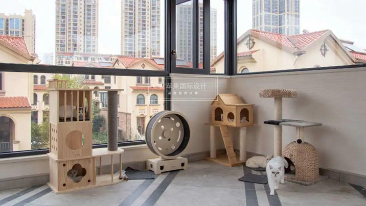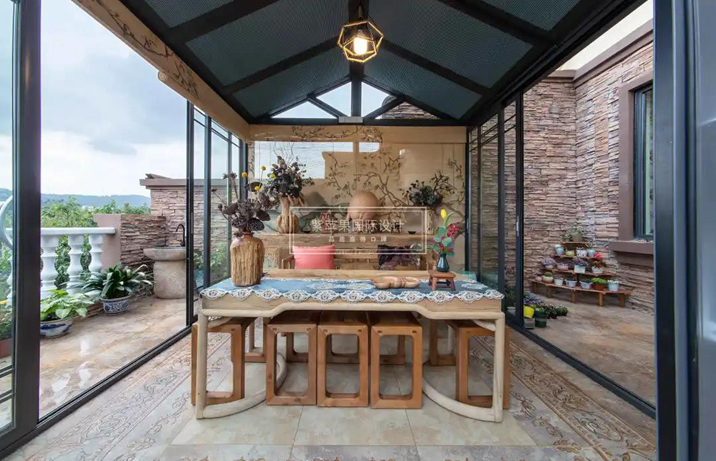 大露臺為南向,解決南向陽光房的隔熱是陽光房設(shè)計的難點,在此陽光房的設(shè)計為中空鋼化+內(nèi)置鋁百葉頂面處理,及四向通風處理,配合繪畫竹簾來完成。
