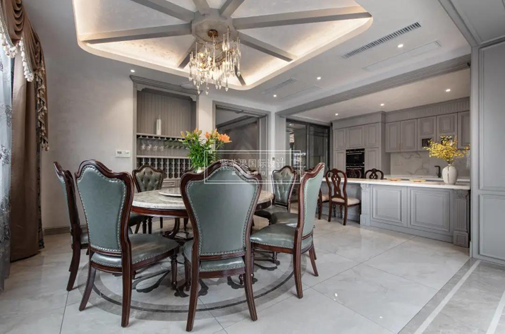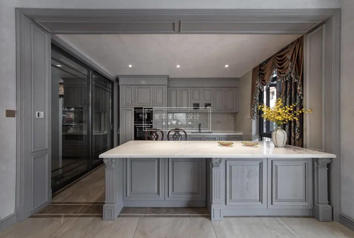 中餐重煙重油,單獨封閉設(shè)計,外面裝上玻璃門,隔絕油煙;西廚開放式設(shè)計,二字型布局,島臺裝在西廚與餐廳之間用作隔斷,營造出更具情調(diào)的生活氛圍。