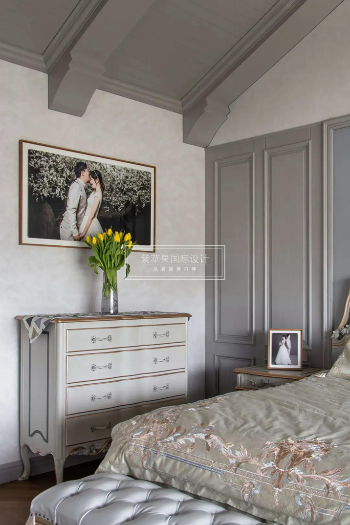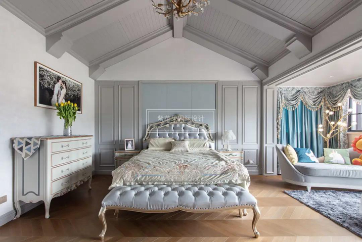 推開臥室的門,我想到了《致愛麗絲》這首鋼琴曲,仿佛看到了女主人溫柔、優(yōu)雅的形象?!拜p裝修,重裝飾”,不做復雜的硬裝設(shè)計,清新美式,淺淡的灰色,融入藍色的硬包背景墻色調(diào),搭配立體雕花、銅色鑲邊的歐式家具,細膩且精致。